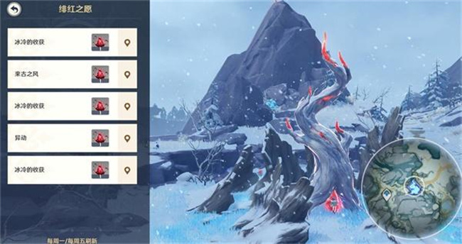 忍冬之树供奉至8级后,将解锁绯红之愿。解锁后每周一和周五将刷新5个绯红之愿任务,完成对应挑战,将获得绯红玉髓。雪山区域可探索的绯红玉髓数量有限,旅行者需完成绯红之愿任务,继续积攒绯红玉髓升级忍冬之树。