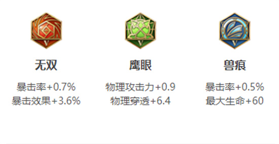 伽罗的铭文使用下图这套比较保守,想要提升攻速可以把【兽痕】换成【狩猎】,可增加10%的攻速。