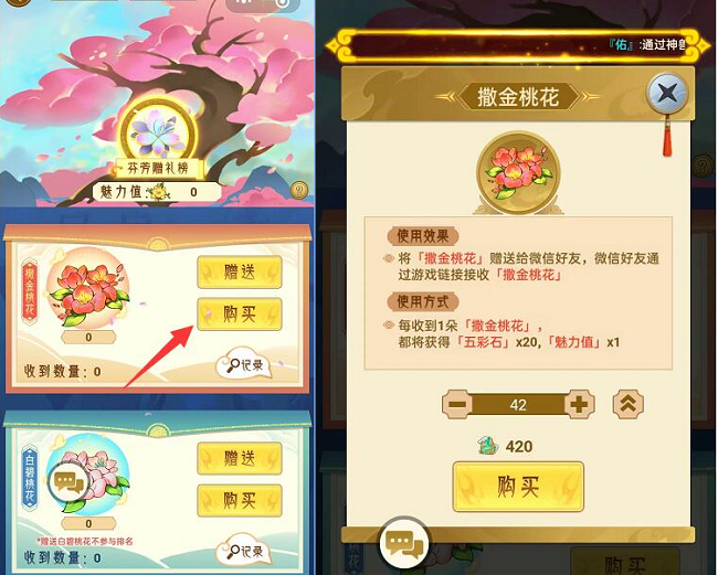4.点击购买撒金桃花,即可用贡献兑换撒金桃花,10贡献购买一朵。注:金花和白花功能一样,但贡献只能兑换撒金桃花。