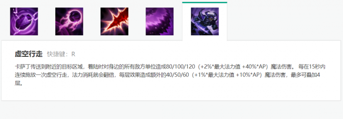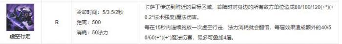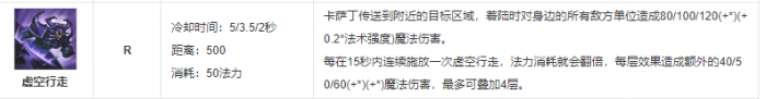 虚空行走:卡萨丁传送到附近的目标区域,着陆时对身边的所有敌方单位造成魔法伤害。 每在15秒内连续施放一次虚空行走,法力消耗就会翻倍,每层效果造成额外魔法伤害,最多可叠加4层。